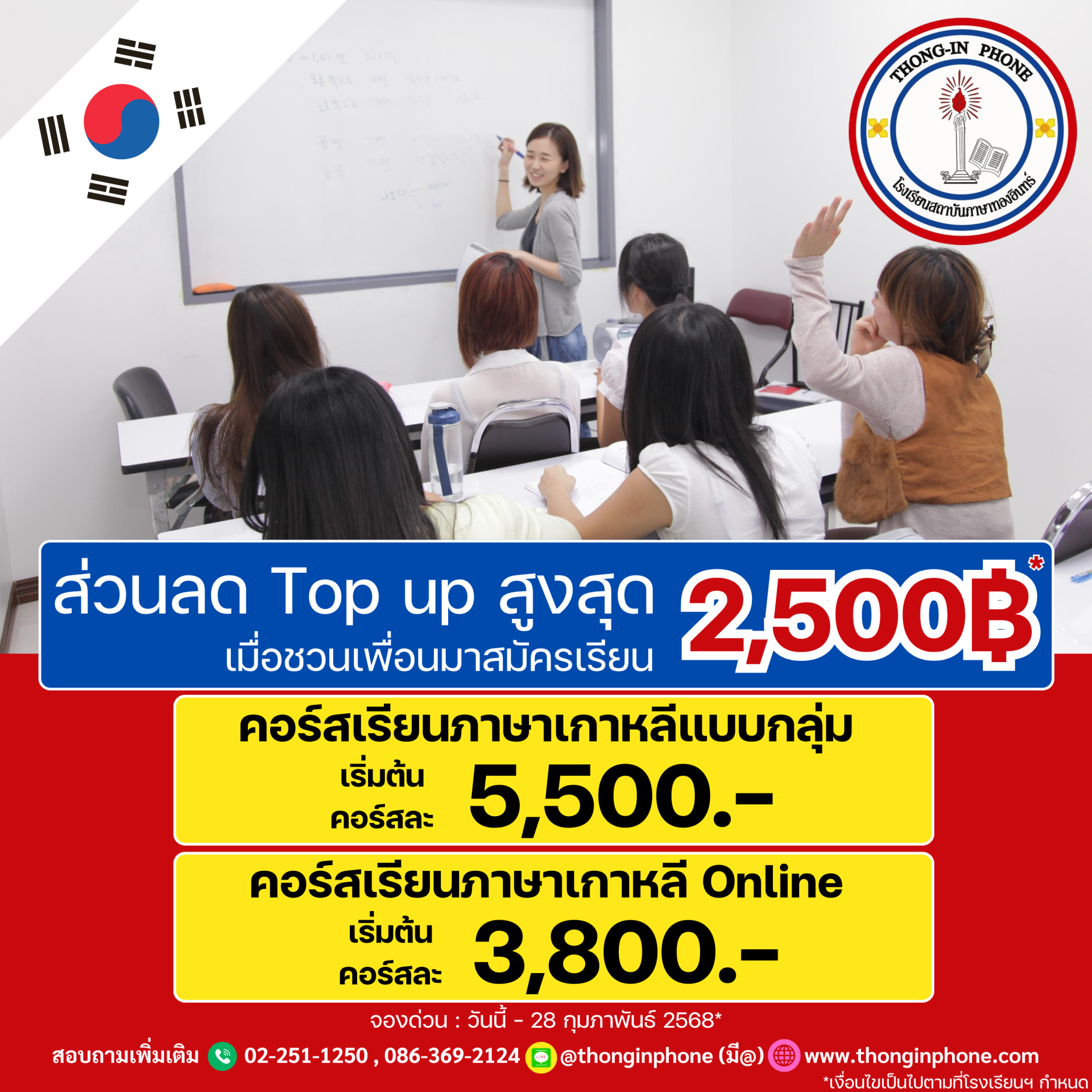 เพียงชวนเพื่อนมาเรียนกันเป็นกลุ่มตั้งแต่ 2 คนขึ้นไป รับส่วนลด Top up ไปเลยสูงสุด 2,500 บาท เมื่อสมัครคอร์สเรียนภาษาเกาหลีแบบกลุ่ม ตั้งแต่วันนี้ - 28 กุมภาพันธ์ 2568 (มีจำนวนจำกัด หมดแล้วหมดเลยนะคะ)*